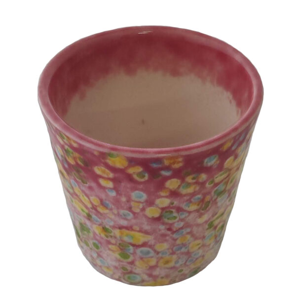 Na nossa coleção de cerâmica Pingada utilizamos barro branco que depois é pingado com tinta num processo especifico, por fim, finaliza no forno o que lhe confere esta mistura de cores.