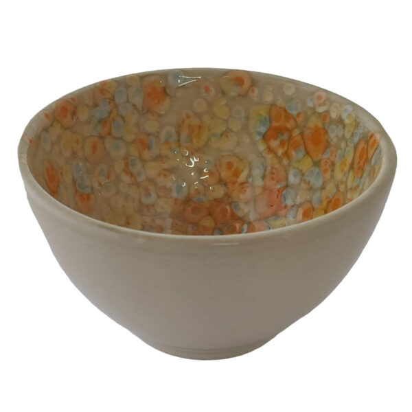 Na nossa coleção de cerâmica Pingada utilizamos barro branco que depois é pingado com tinta num processo especifico, por fim, finaliza no forno o que lhe confere esta mistura de cores.